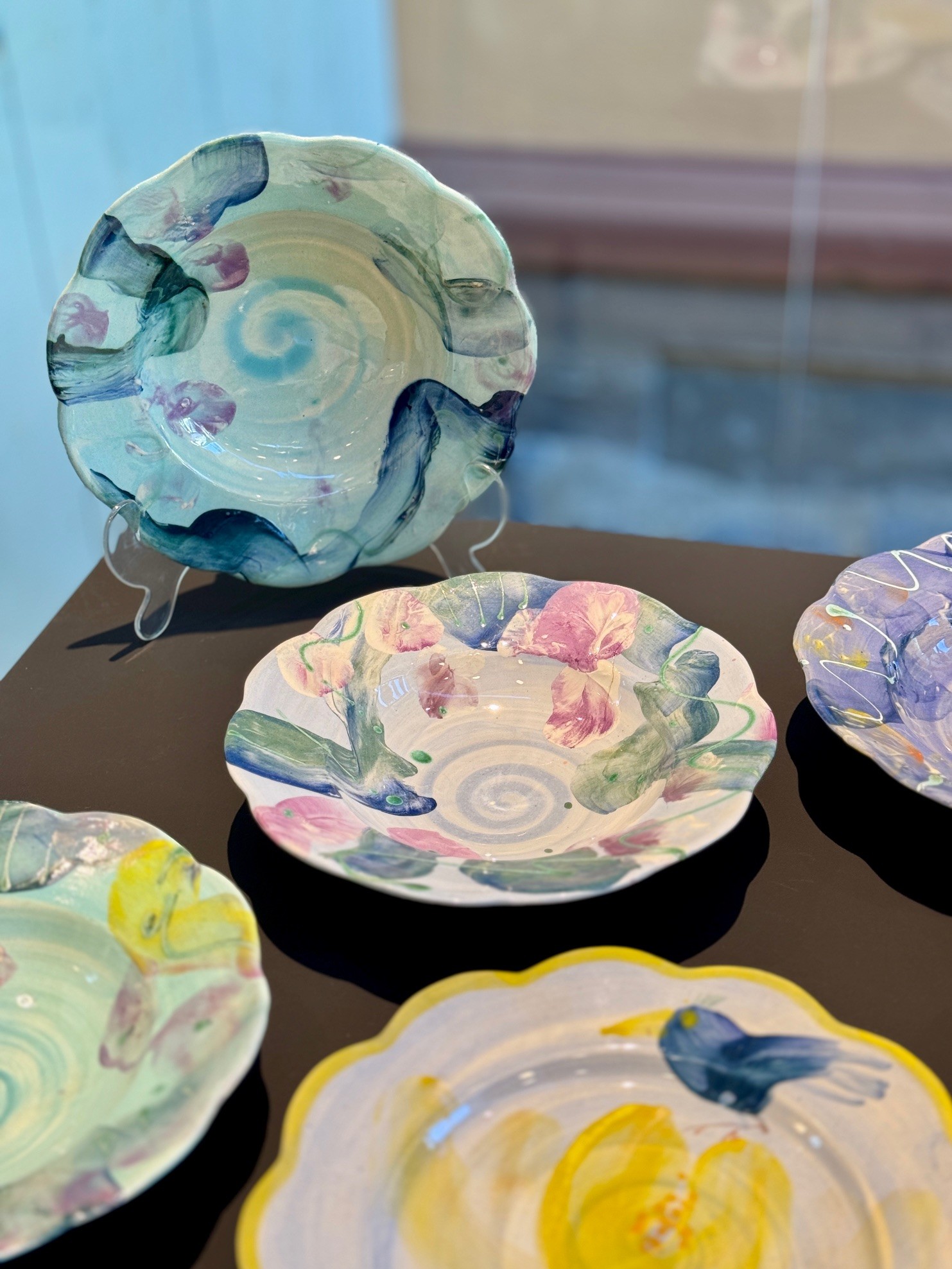 Victoria Berge (f.1945) jobber som keramiker, og med bakgrunn innen tegning, grafikk og maleri, overfører hun grafiske teknikker, som litografi og tresnitt, til gipsplater og flytende leire. Hun maler med begitning (farget, flytende leire) som om det var akvarellmaling, og med sine lekende penselstrøk lager han fargeglade kopper, tallerkener og fat. Til sine utstillinger utfordrer hun seg selv til å skape nye uttrykk, blant annet større arbeider med figurative strukturer. Vi selger hennes tallerkener.