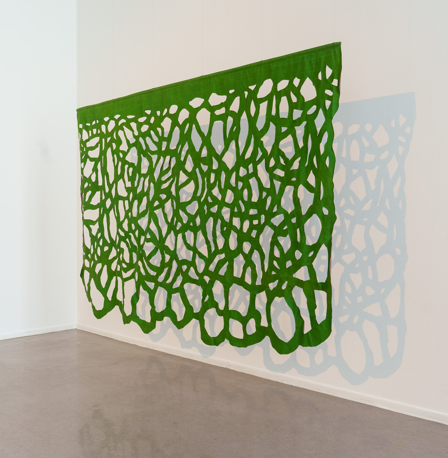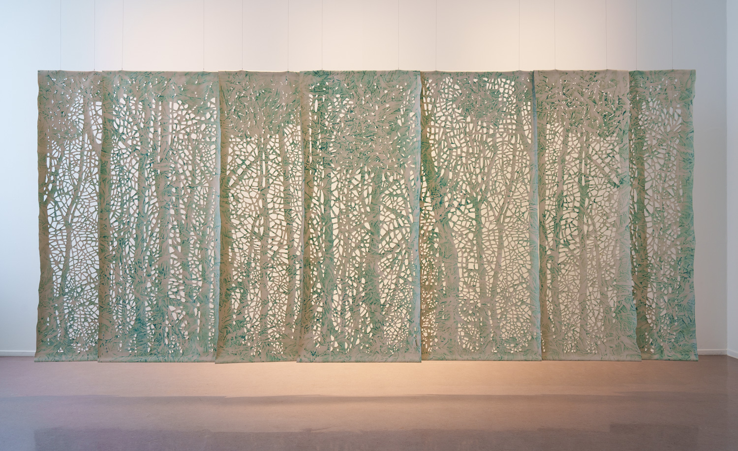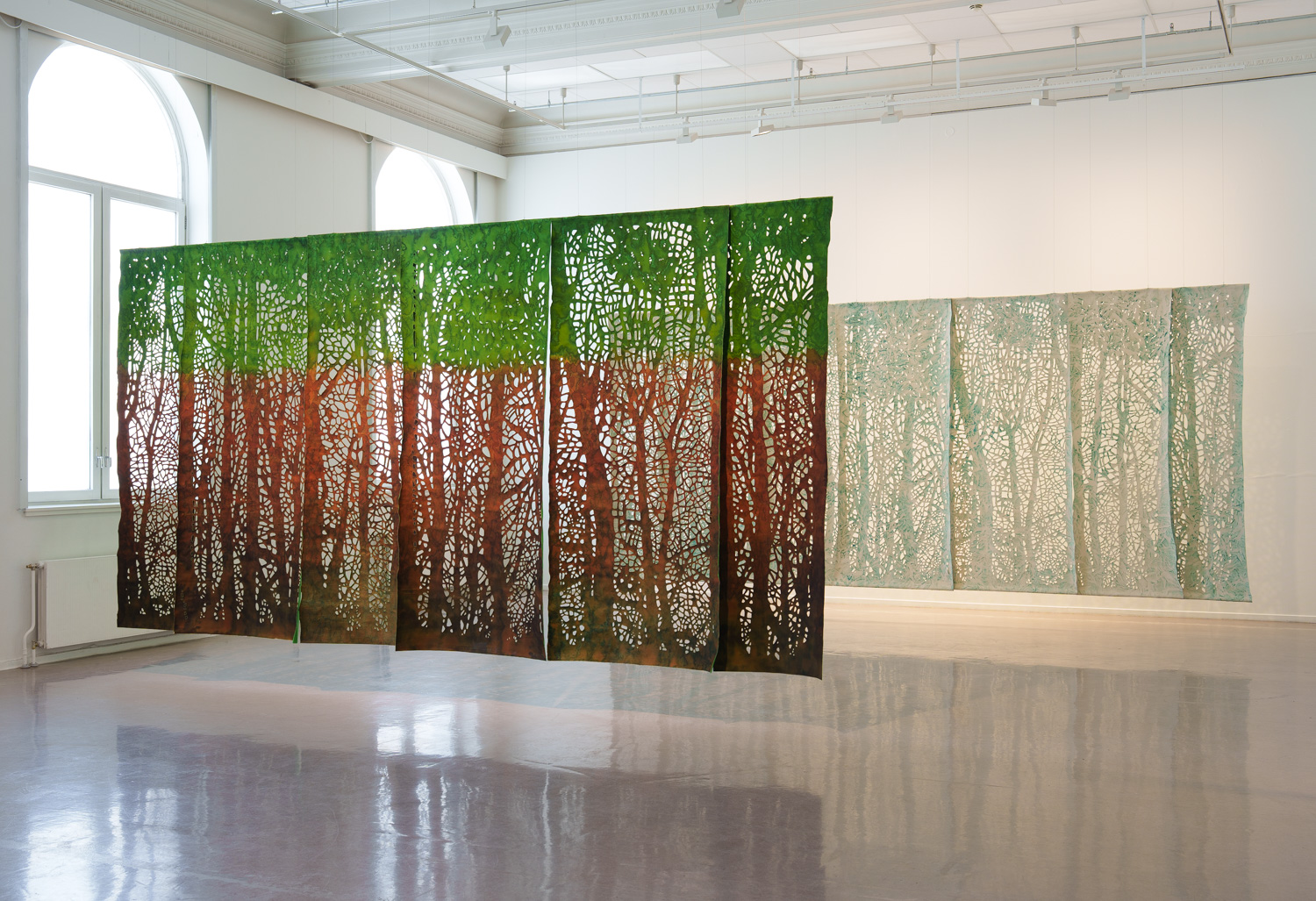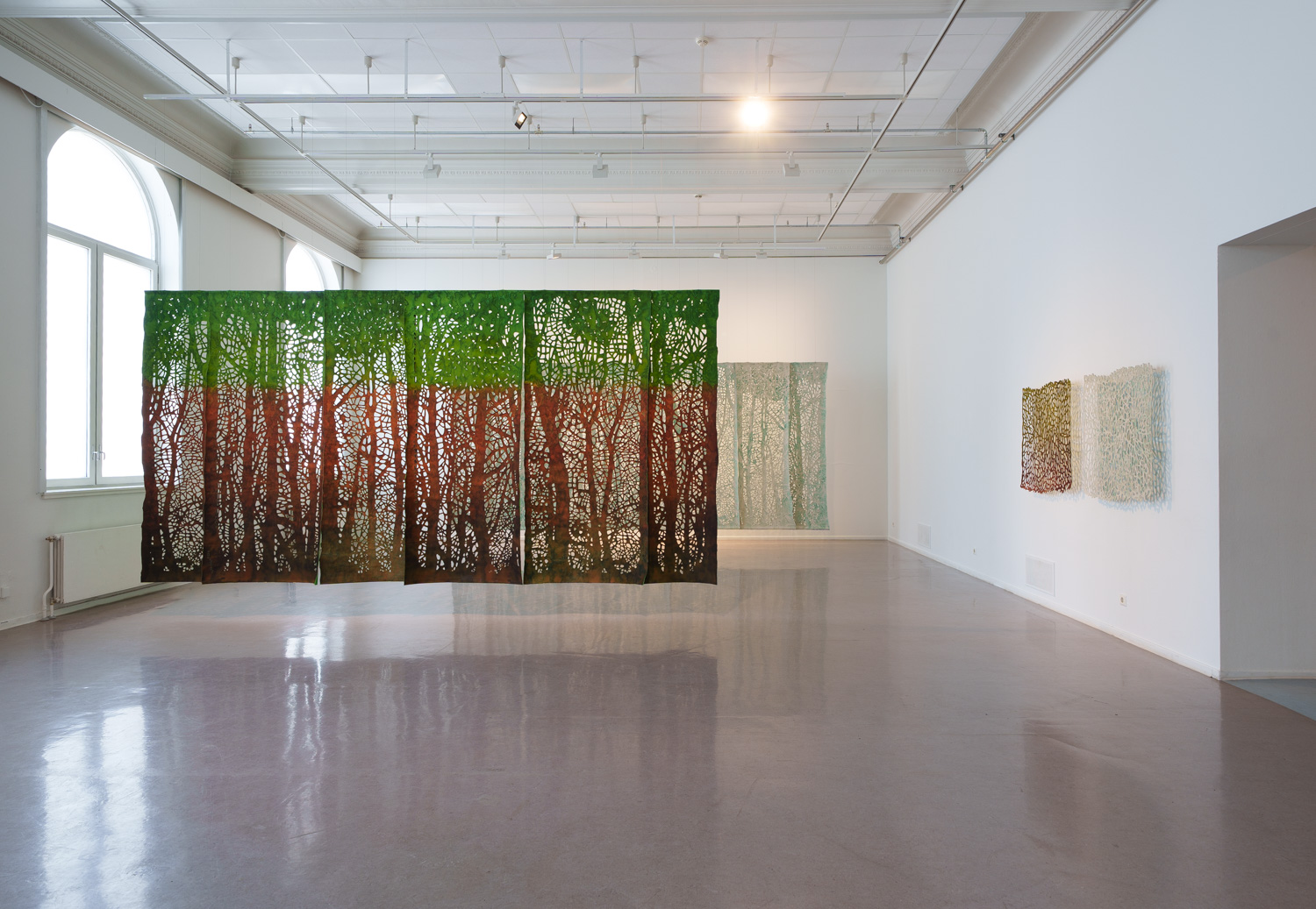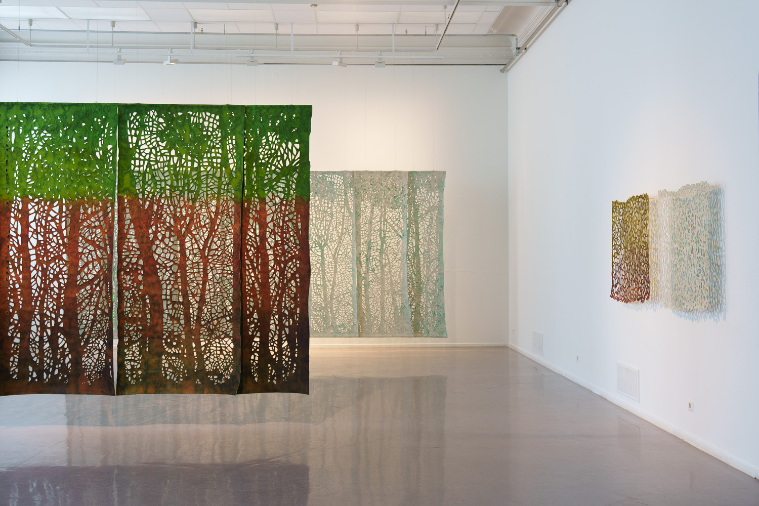 is known for her unique blend of traditional craftsmanship and modern technology. In this exhibition, she presents new textiles under the working title En undersøkelse av et skogholt [A study of a forest grove]. The title refers to the forest as a contemplative, almost sacred space, exploring how society relates to untouched and vulnerable forests. Aarset, who has previously worked with organic and rhythmic patterns, is now experimenting with a more naturalistic expression presented in larger formats.