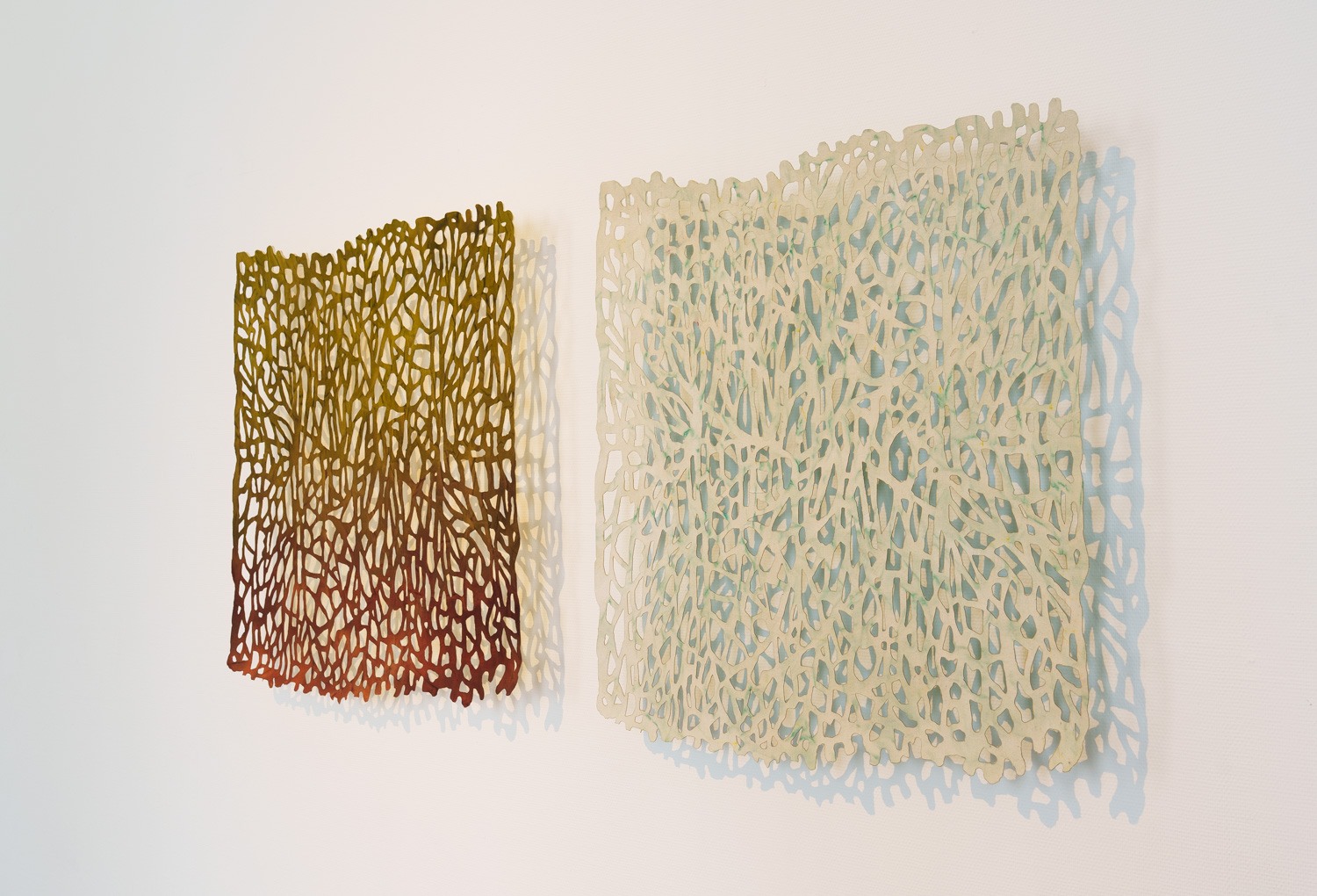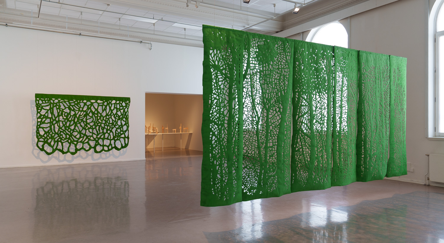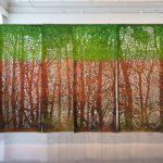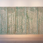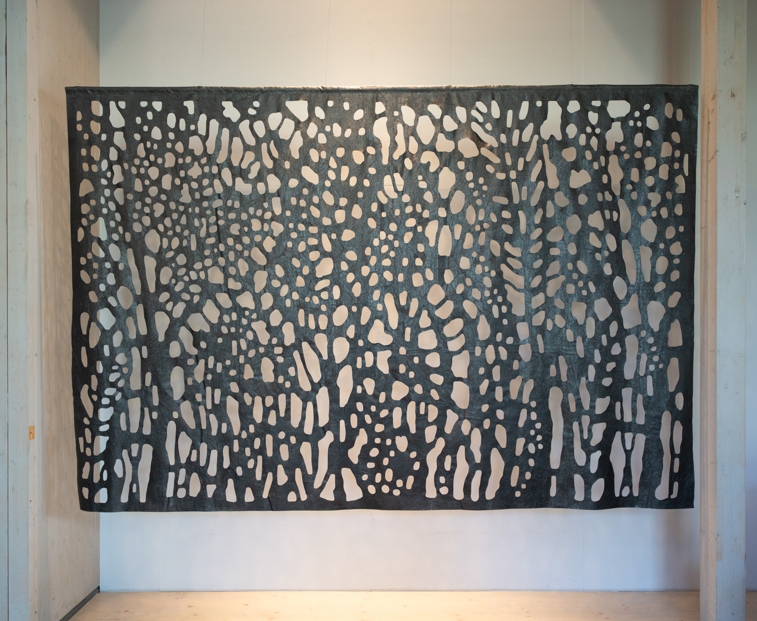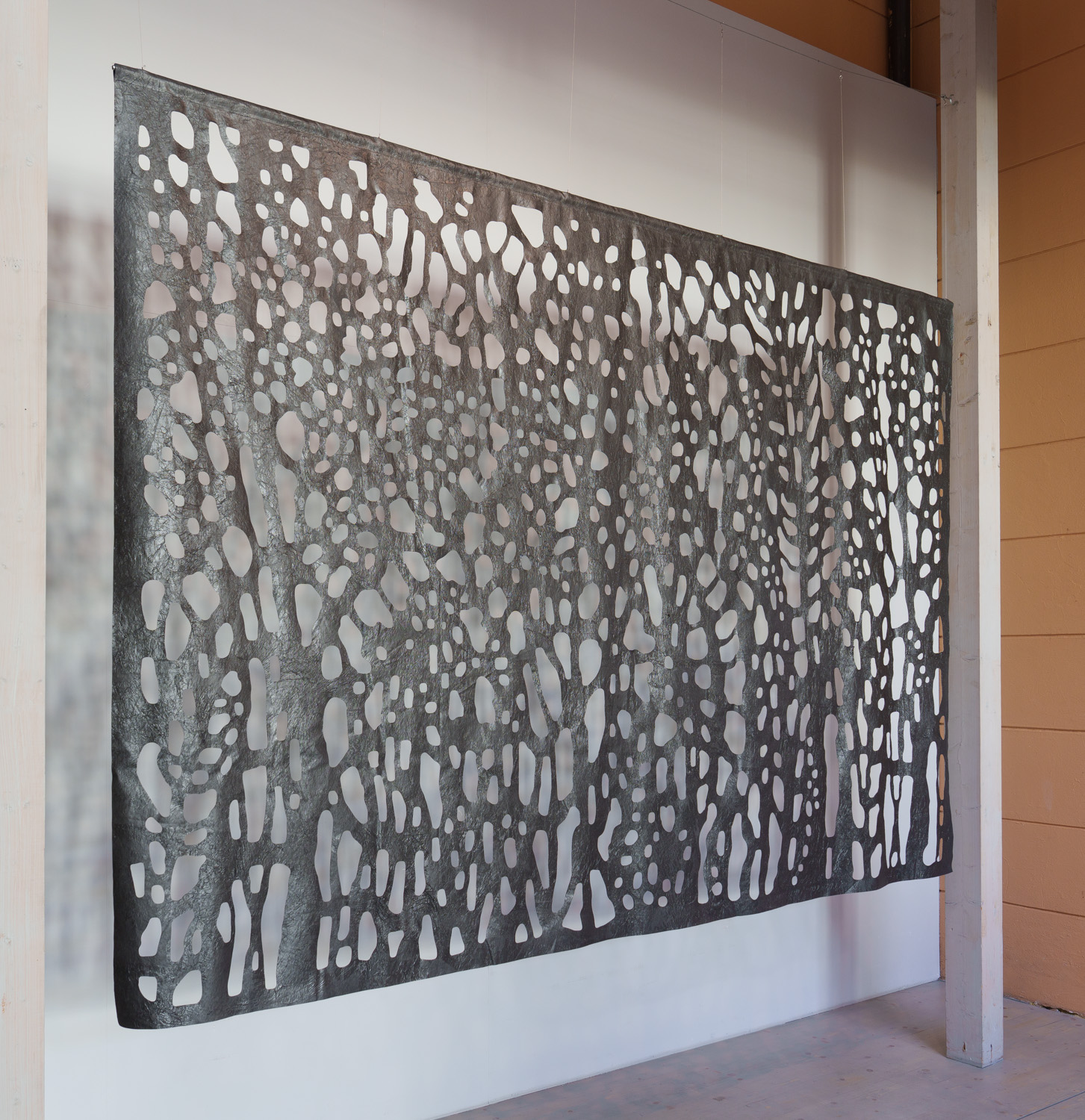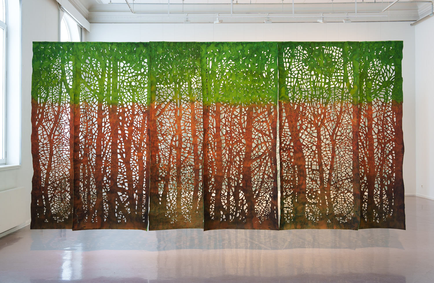 is known for her unique blend of traditional craftsmanship and modern technology. In this exhibition, she presents new textiles under the working title En undersøkelse av et skogholt [A study of a forest grove]. The title refers to the forest as a contemplative, almost sacred space, exploring how society relates to untouched and vulnerable forests. Aarset, who has previously worked with organic and rhythmic patterns, is now experimenting with a more naturalistic expression presented in larger formats.