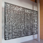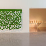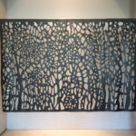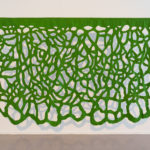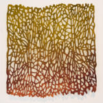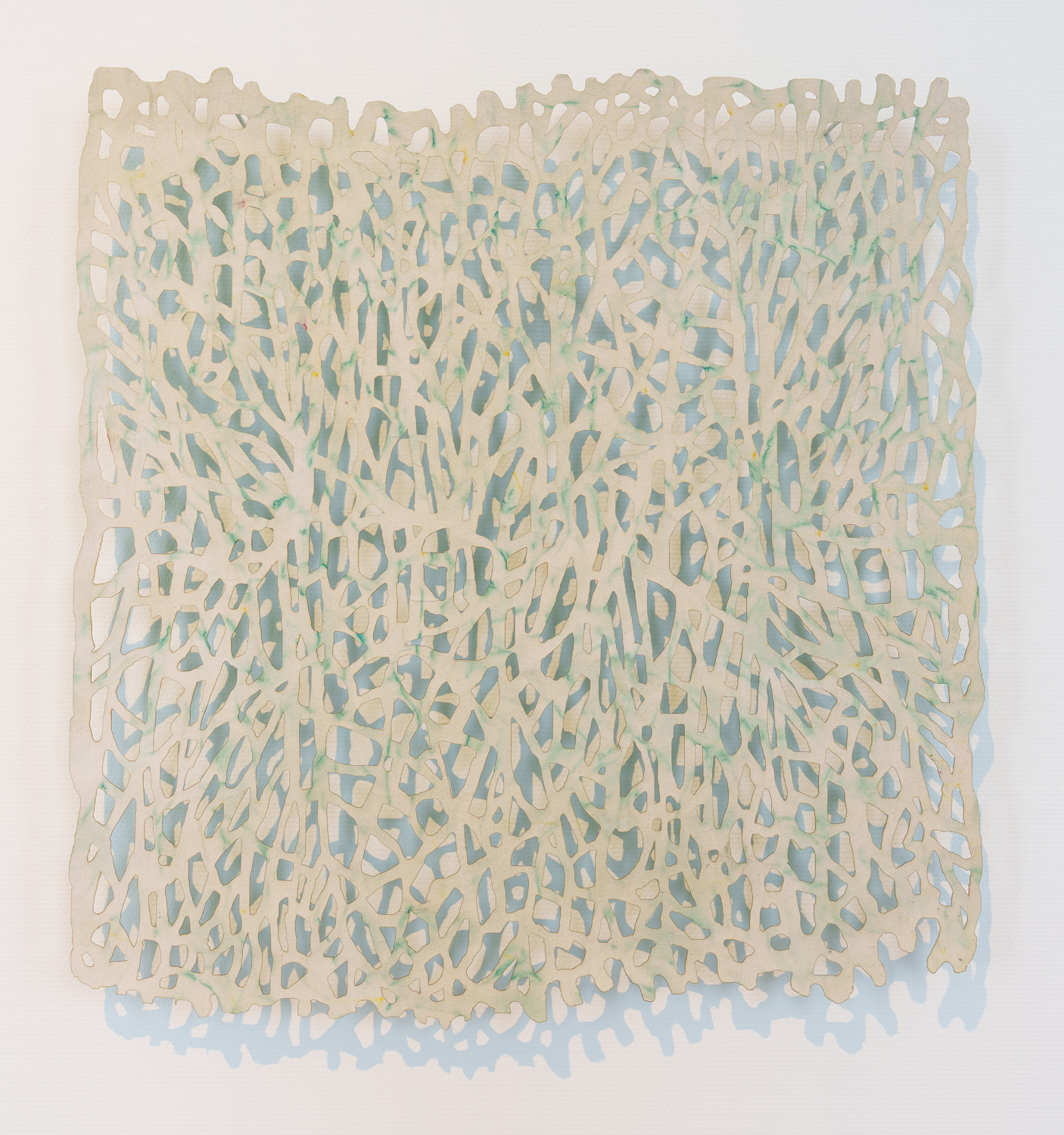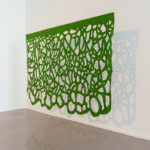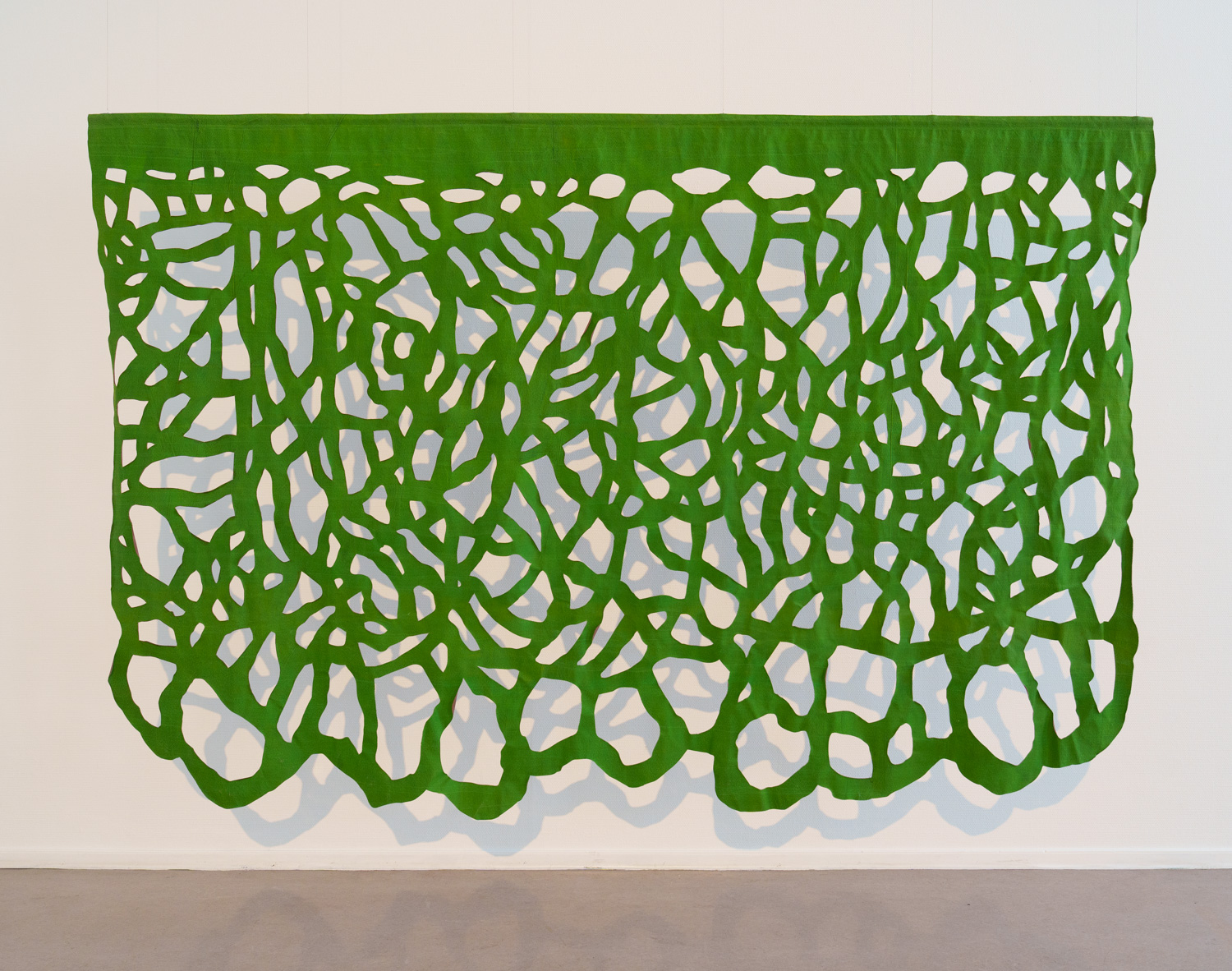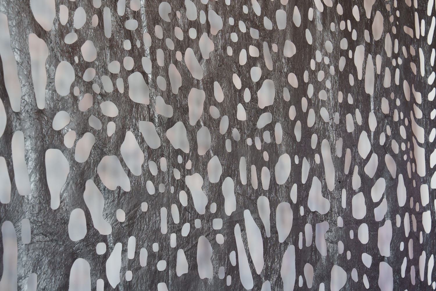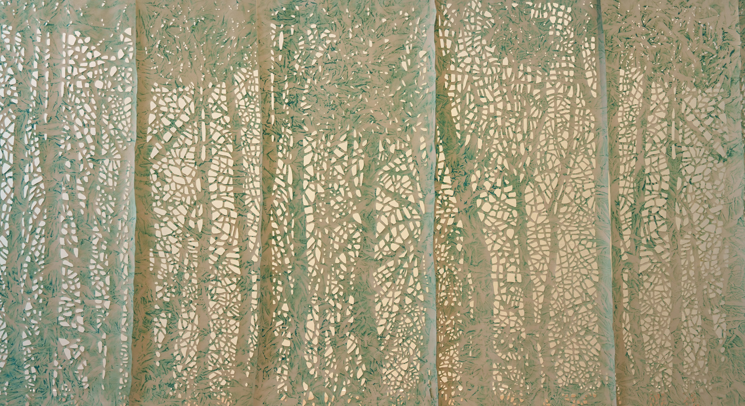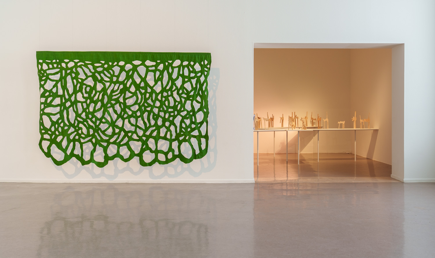 is known for her unique blend of traditional craftsmanship and modern technology. In this exhibition, she presents new textiles under the working title En undersøkelse av et skogholt [A study of a forest grove]. The title refers to the forest as a contemplative, almost sacred space, exploring how society relates to untouched and vulnerable forests. Aarset, who has previously worked with organic and rhythmic patterns, is now experimenting with a more naturalistic expression presented in larger formats.