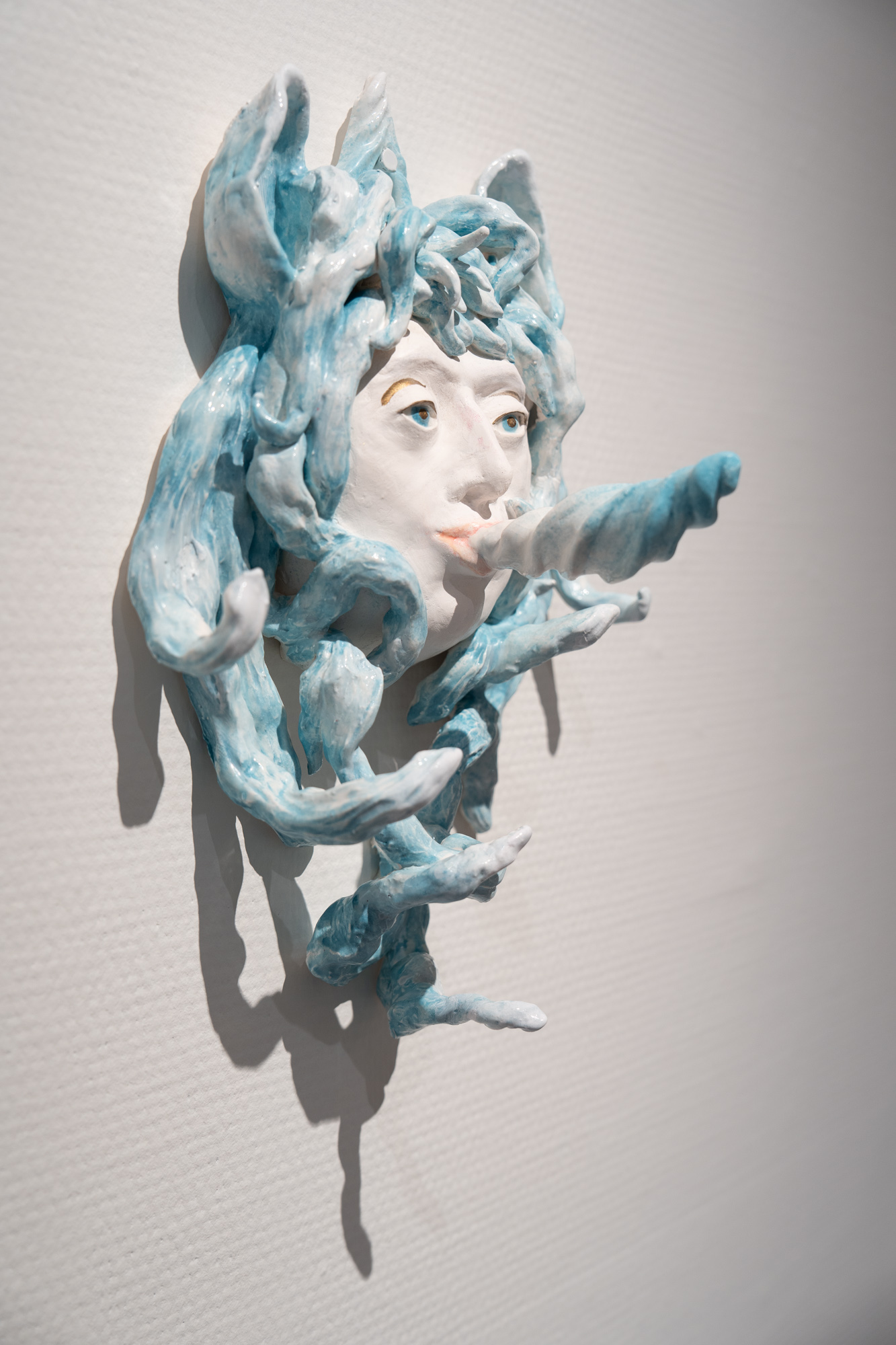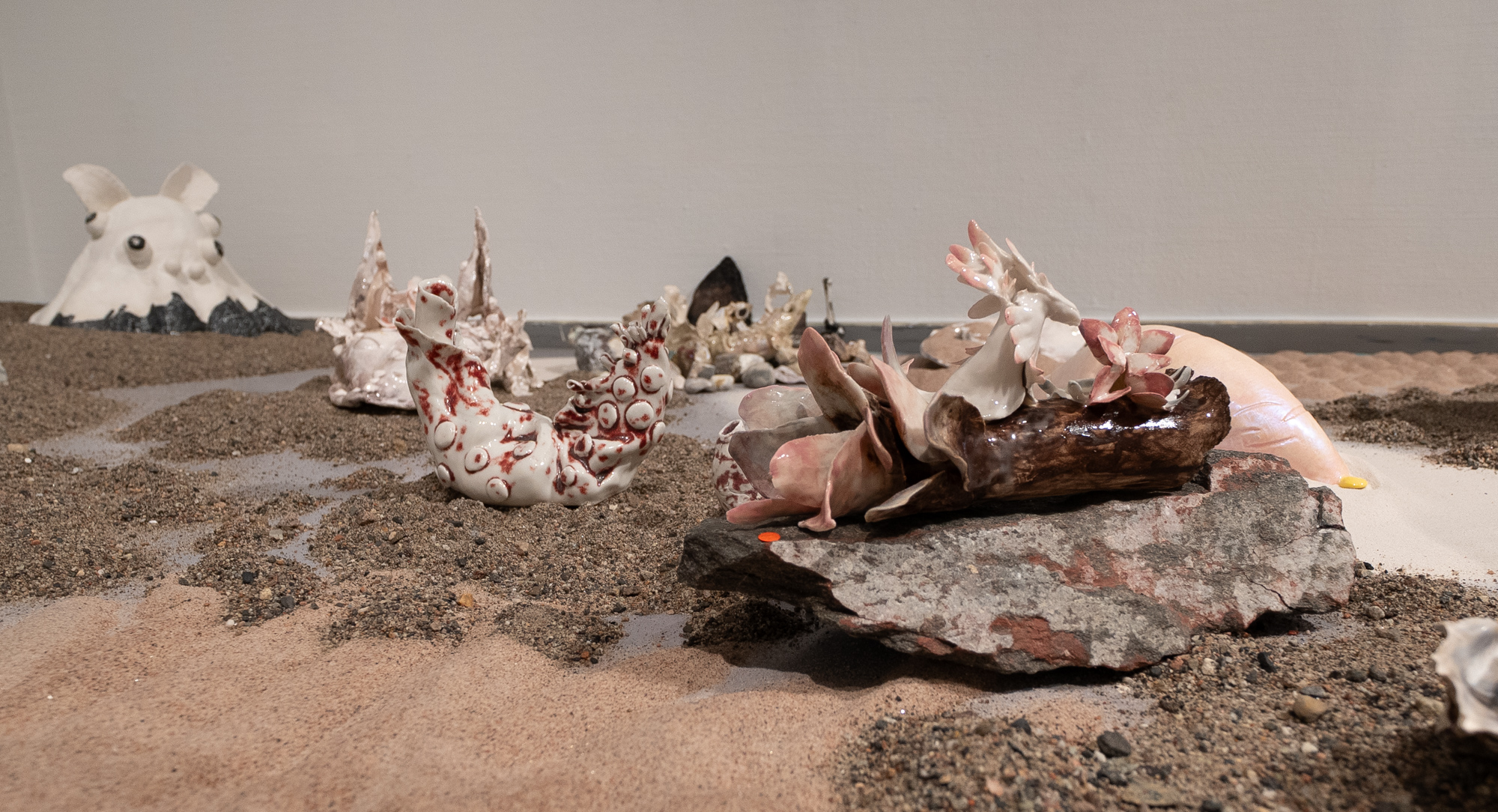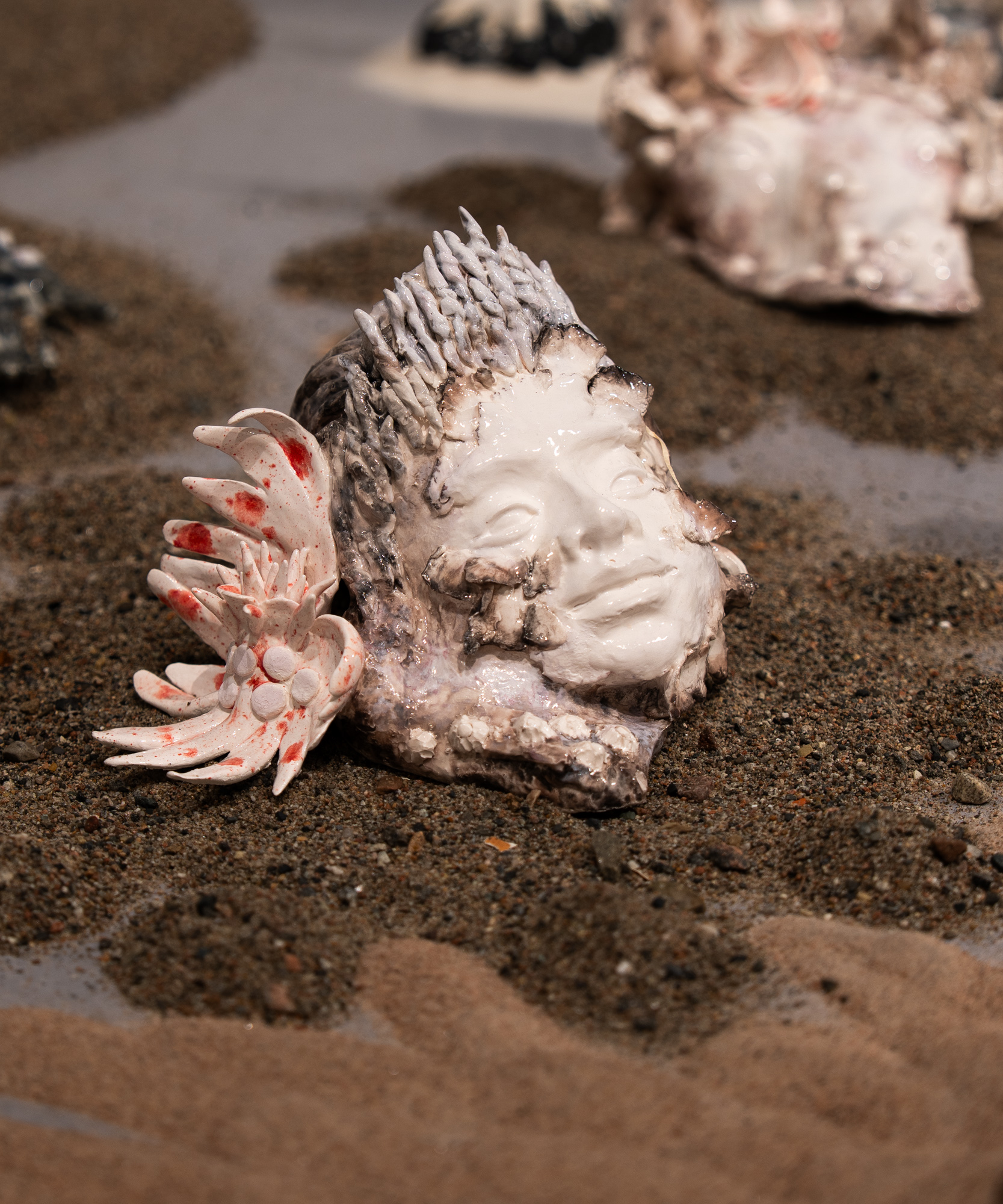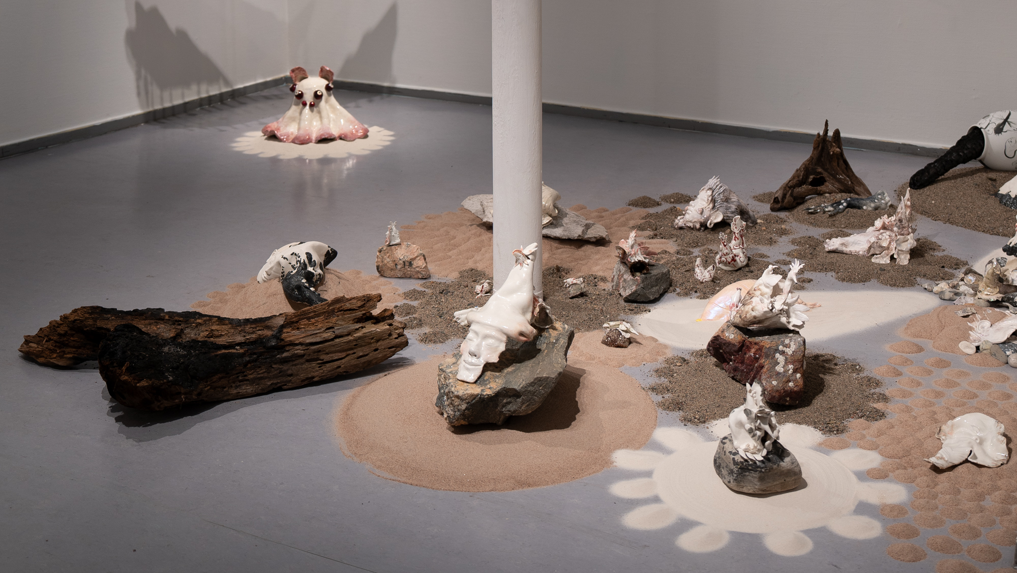 Päivi Laakso’s installation, along with its individual works, visualizes the mythological and spiritual aspects of nature, our culture, and our psyche. It is a dreamlike scene, where the work on the floor depicts the seabed, where remnants of ancient sculptures have become homes for sea creatures. Parts of the reliefs point to the divine and the eternal alongside the transient — civilizations and empires that decay, are worn down by time, and disappear. Norwegian and Nordic symbols and materials tie our story to the heritage of antiquity and ancient times. It has been important for the artist to use earthy materials, which in turn influence the form the artworks take.
