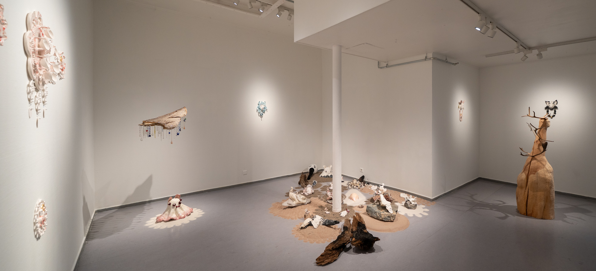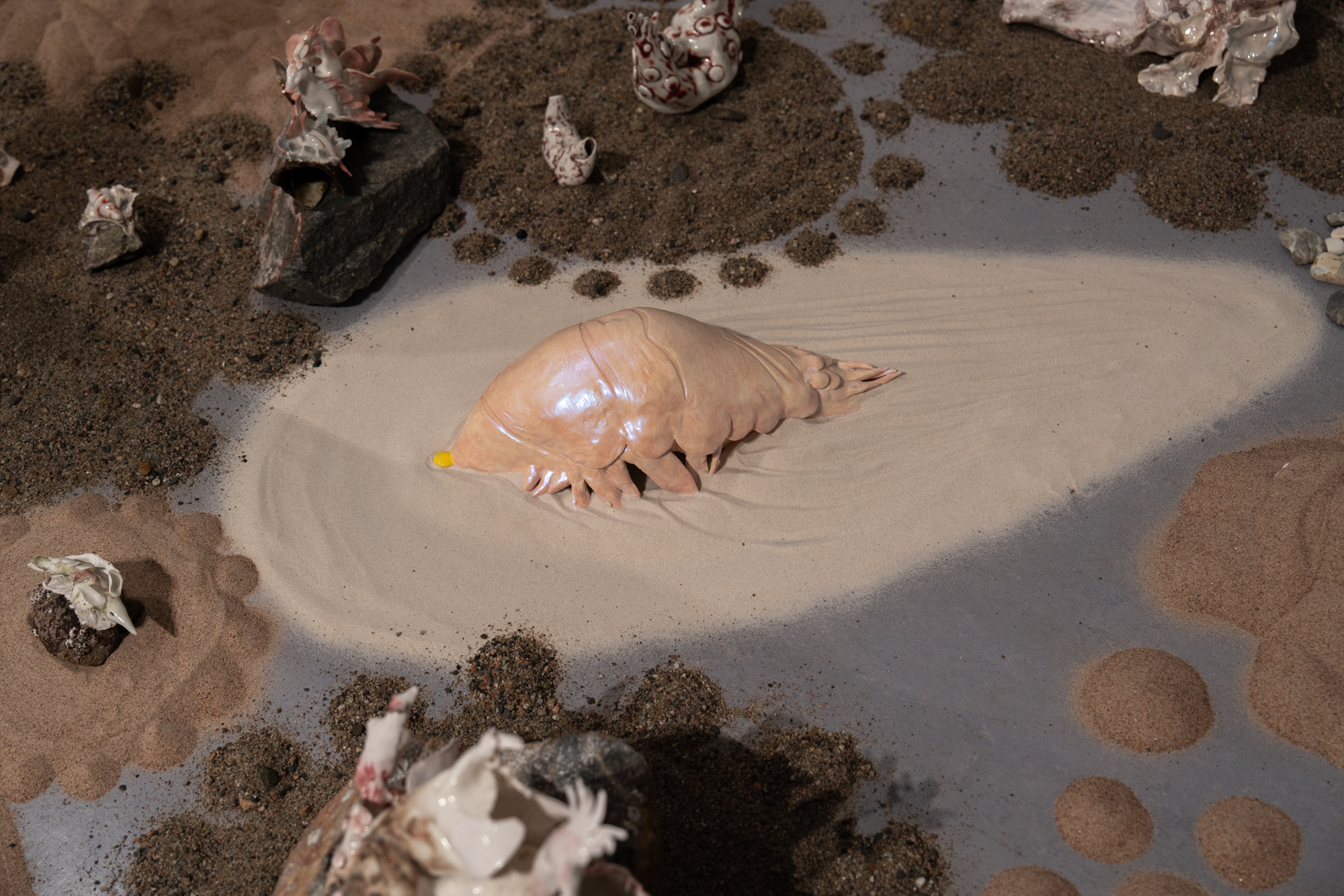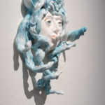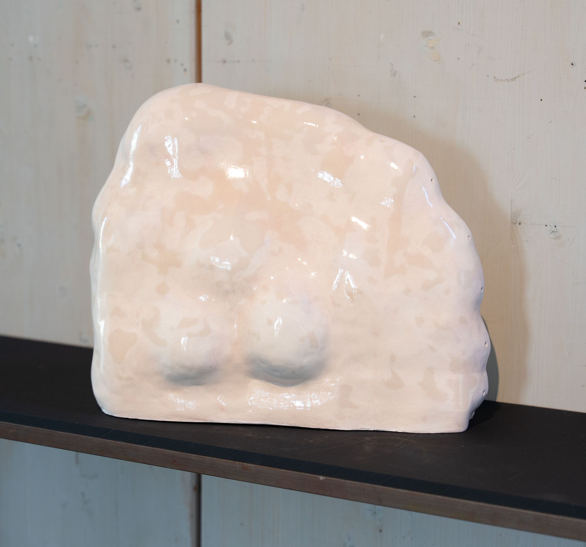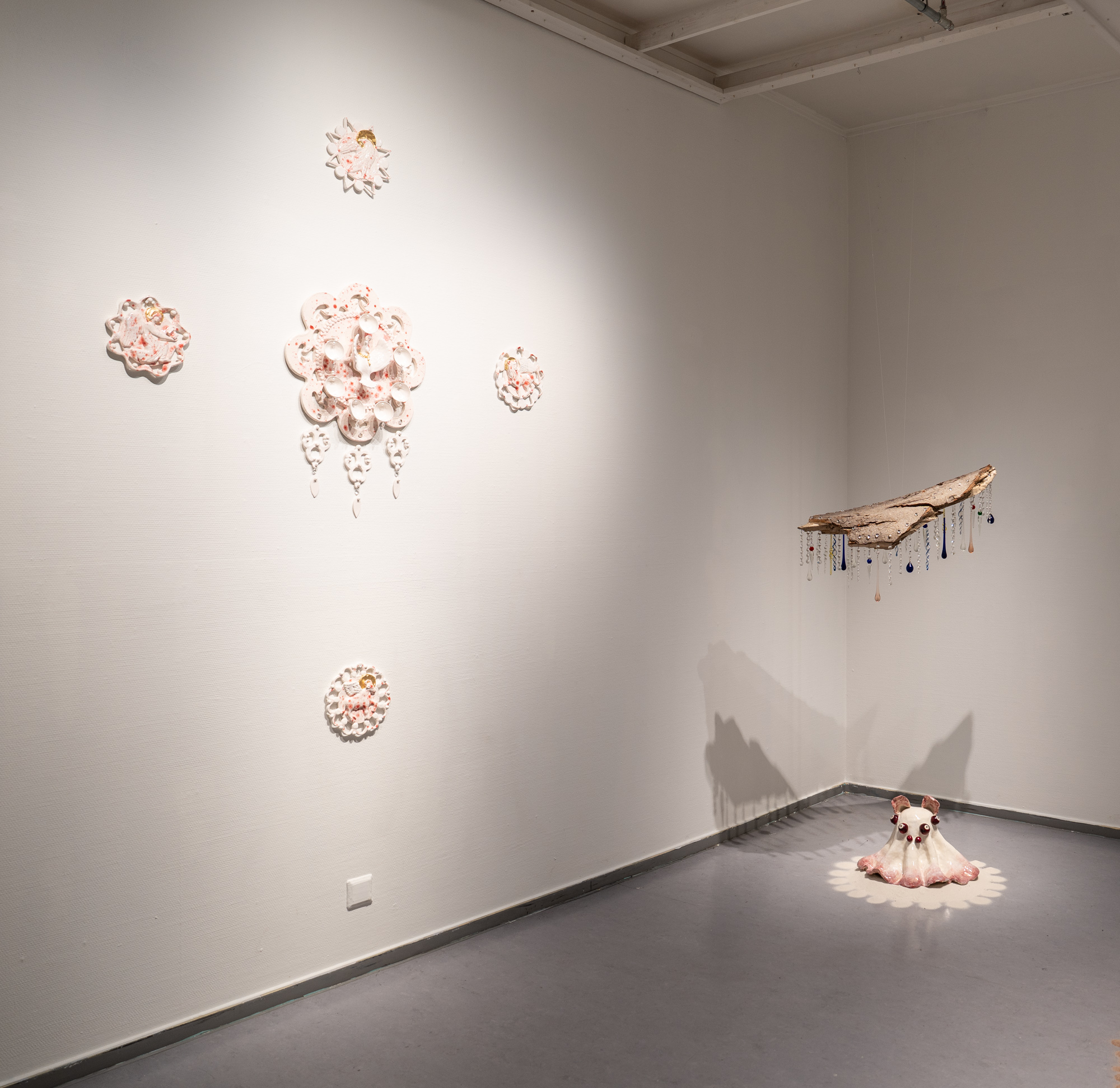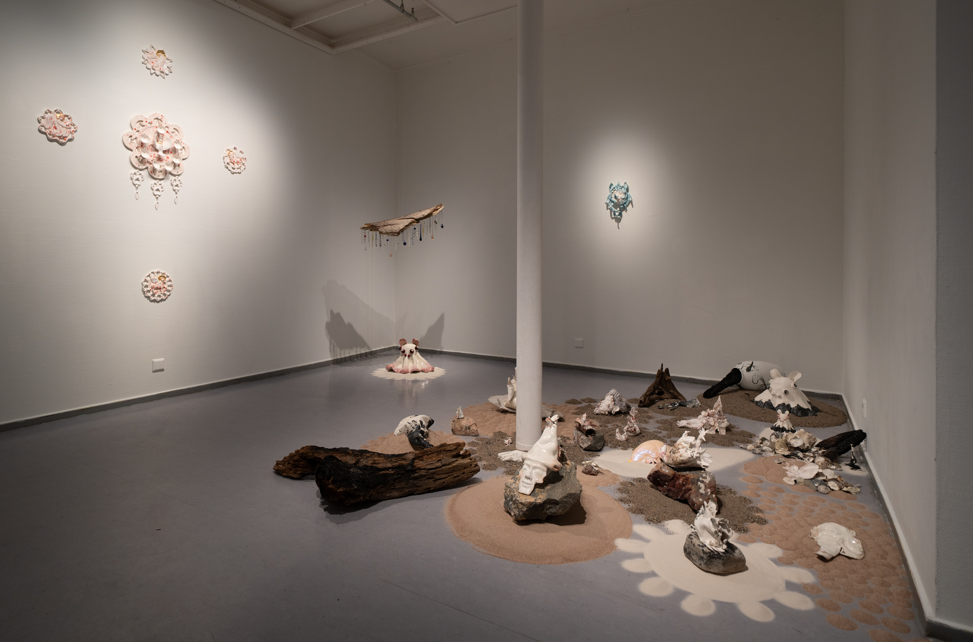 Päivi Laakso’s installation, along with its individual works, visualizes the mythological and spiritual aspects of nature, our culture, and our psyche. It is a dreamlike scene, where the work on the floor depicts the seabed, where remnants of ancient sculptures have become homes for sea creatures. Parts of the reliefs point to the divine and the eternal alongside the transient — civilizations and empires that decay, are worn down by time, and disappear. Norwegian and Nordic symbols and materials tie our story to the heritage of antiquity and ancient times. It has been important for the artist to use earthy materials, which in turn influence the form the artworks take.