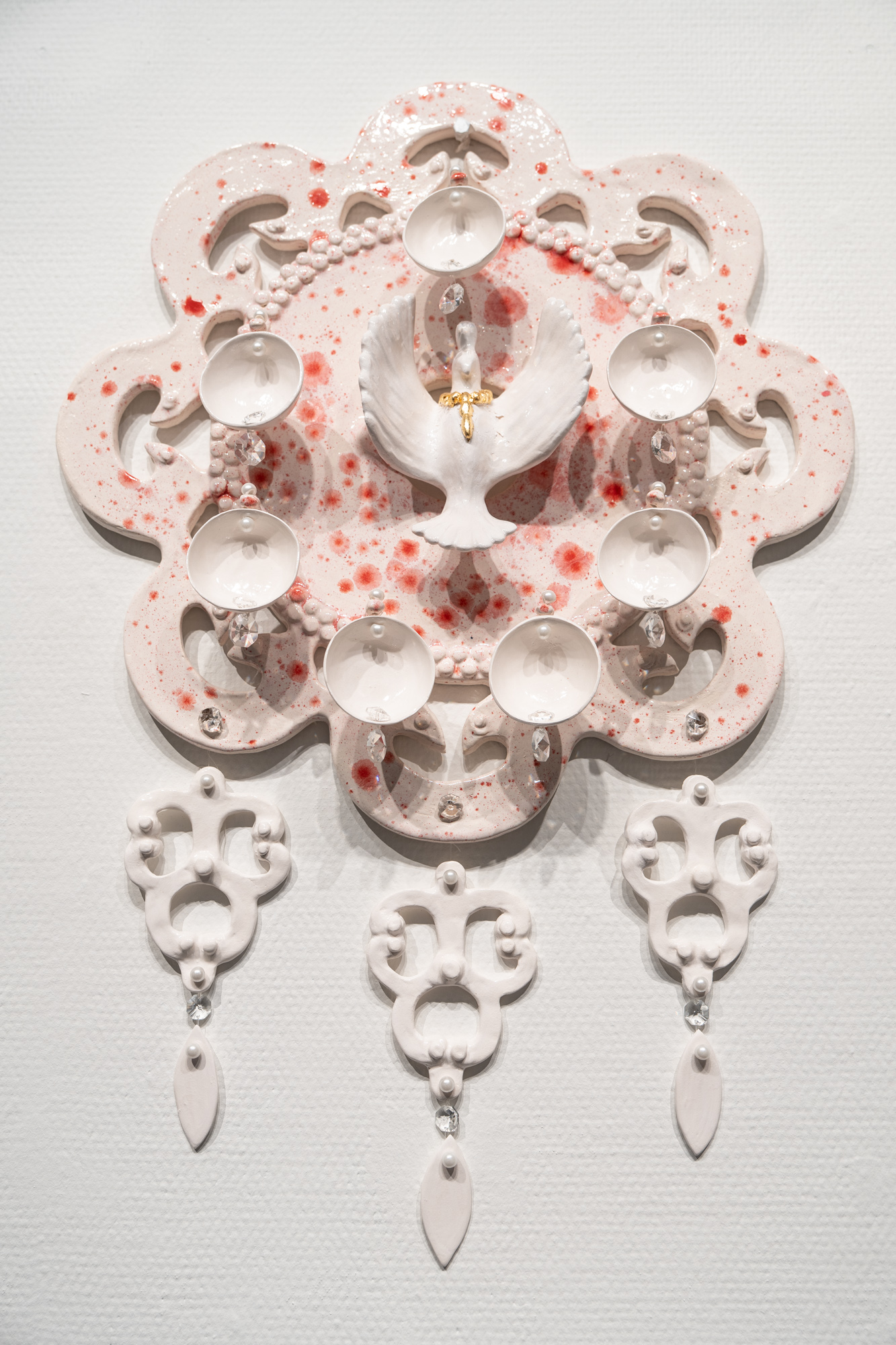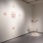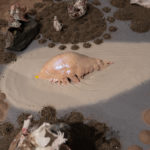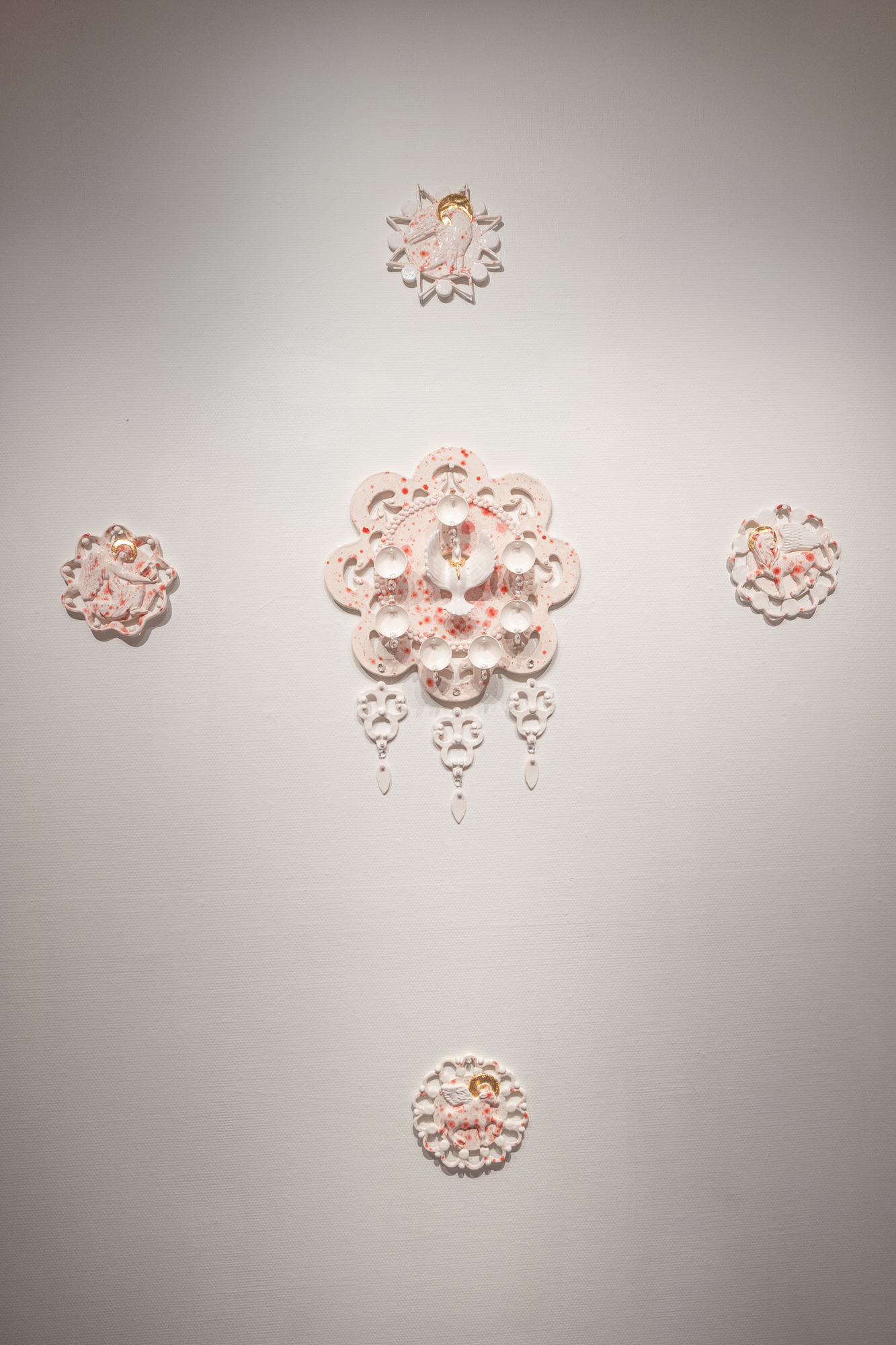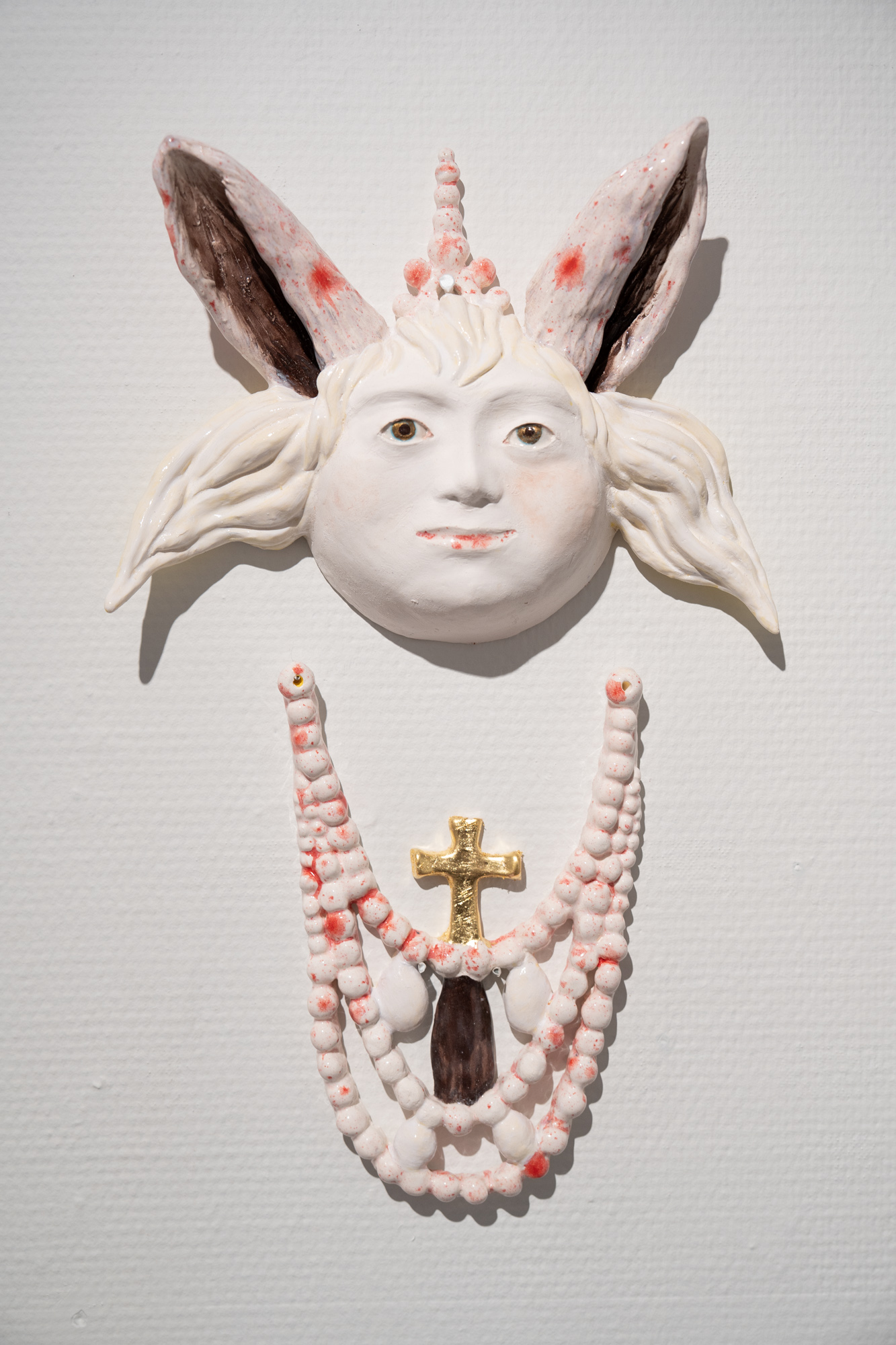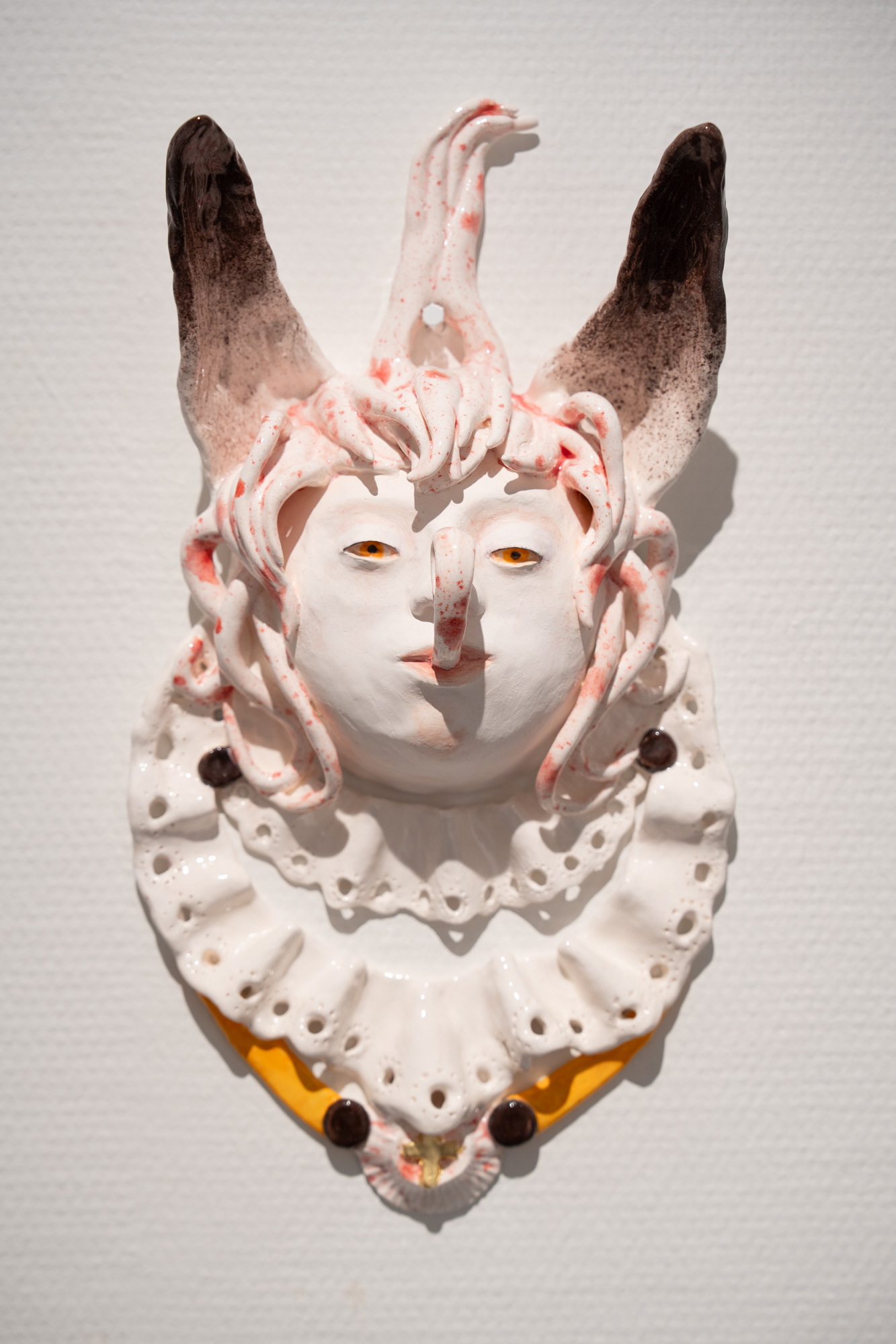 Päivi Laakso’s installation, along with its individual works, visualizes the mythological and spiritual aspects of nature, our culture, and our psyche. It is a dreamlike scene, where the work on the floor depicts the seabed, where remnants of ancient sculptures have become homes for sea creatures. Parts of the reliefs point to the divine and the eternal alongside the transient — civilizations and empires that decay, are worn down by time, and disappear. Norwegian and Nordic symbols and materials tie our story to the heritage of antiquity and ancient times. It has been important for the artist to use earthy materials, which in turn influence the form the artworks take.