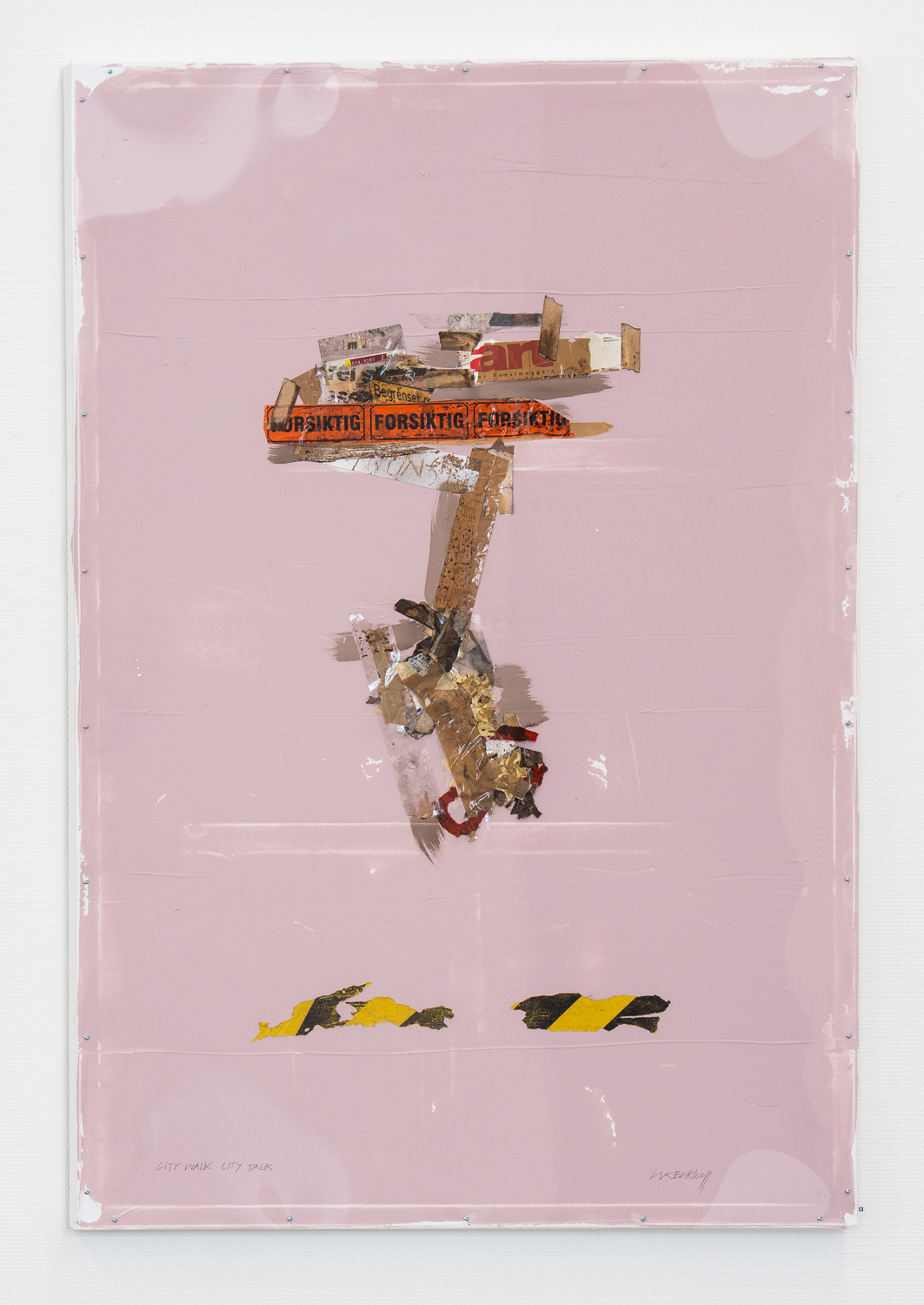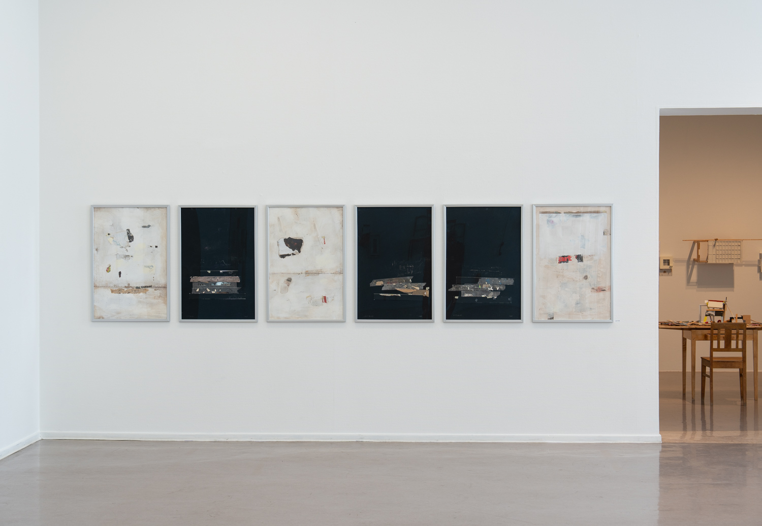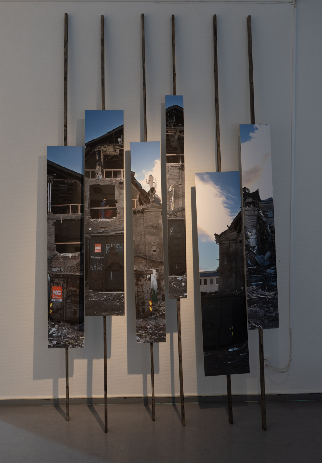Throughout the rest of the building, video, photography, material works, drawings, paintings and collages are displayed. Her work draws inspiration from urban walks, where she collects impressions and materials. She then processes and transforms these elements, exploring the interplay between space and surface, signs and structures, photography and text fragments. The boundary between the real and the imaginary blend into one another, challenging the viewer.
