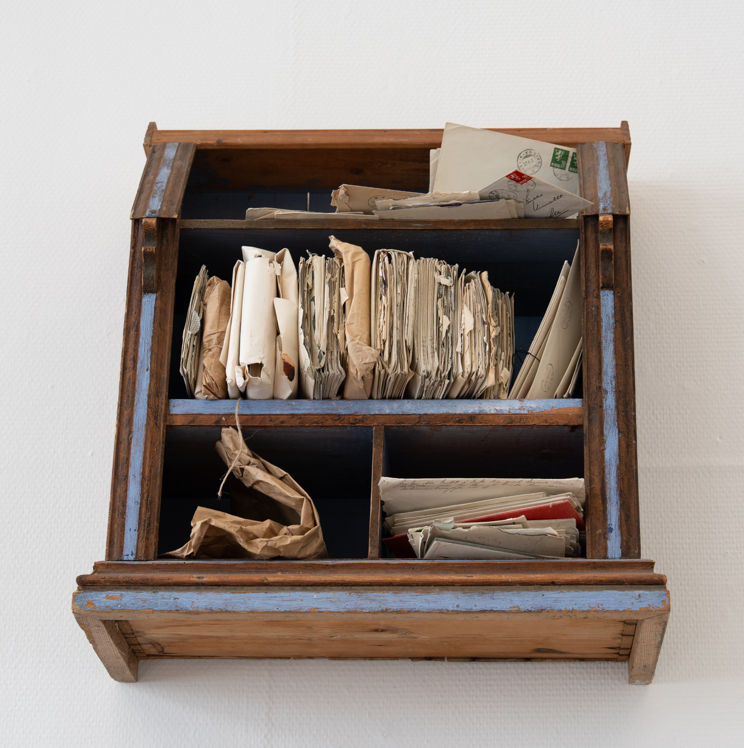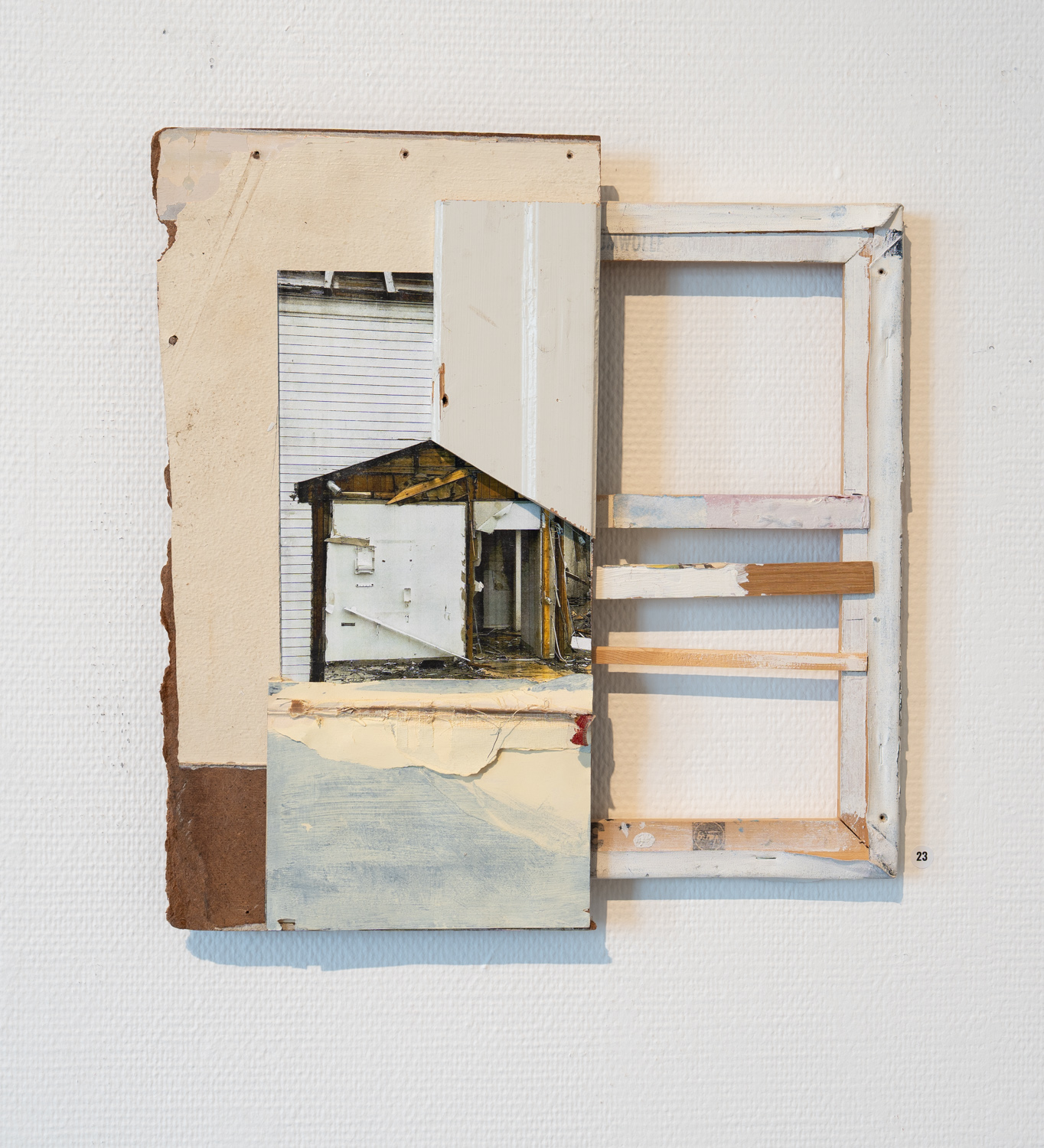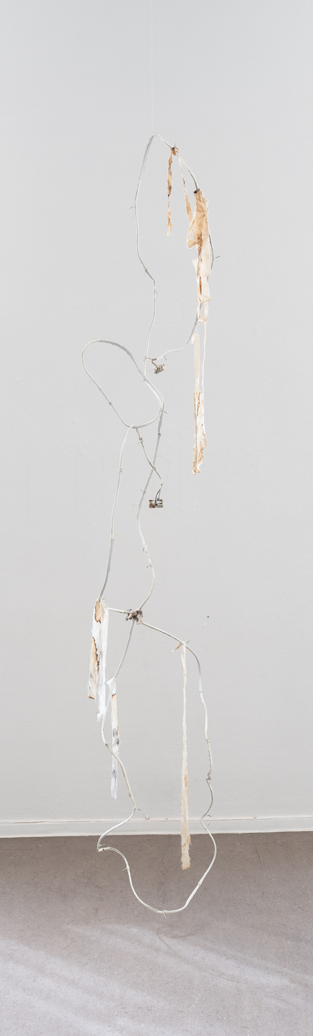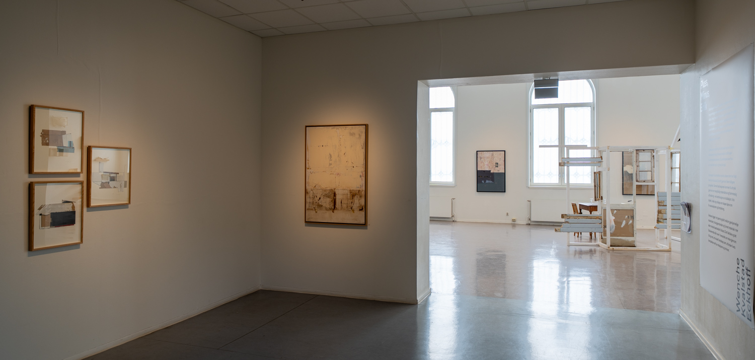 Throughout the rest of the building, video, photography, material works, drawings, paintings and collages are displayed. Her work draws inspiration from urban walks, where she collects impressions and materials. She then processes and transforms these elements, exploring the interplay between space and surface, signs and structures, photography and text fragments. The boundary between the real and the imaginary blend into one another, challenging the viewer.